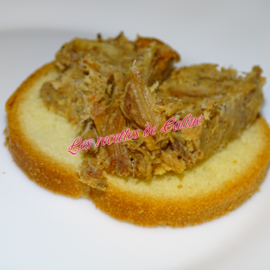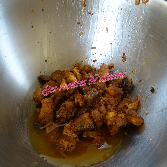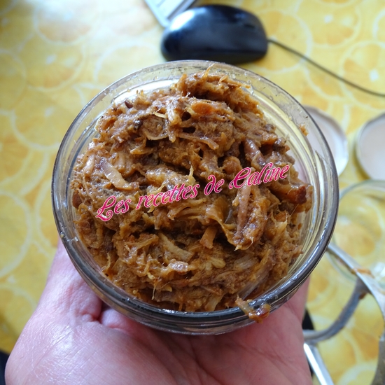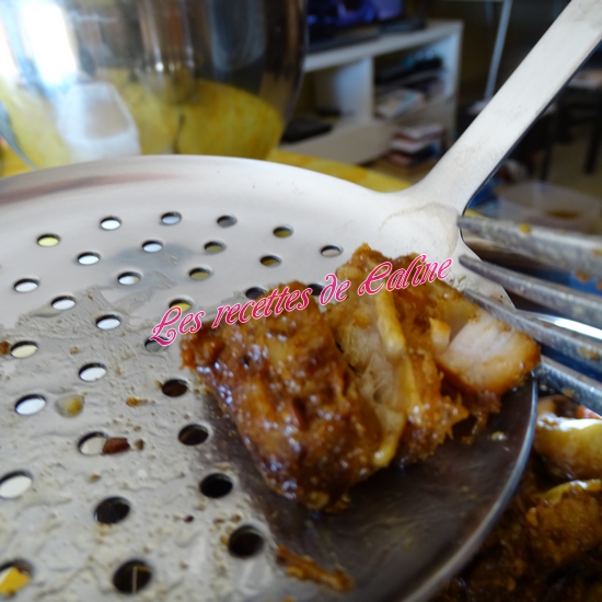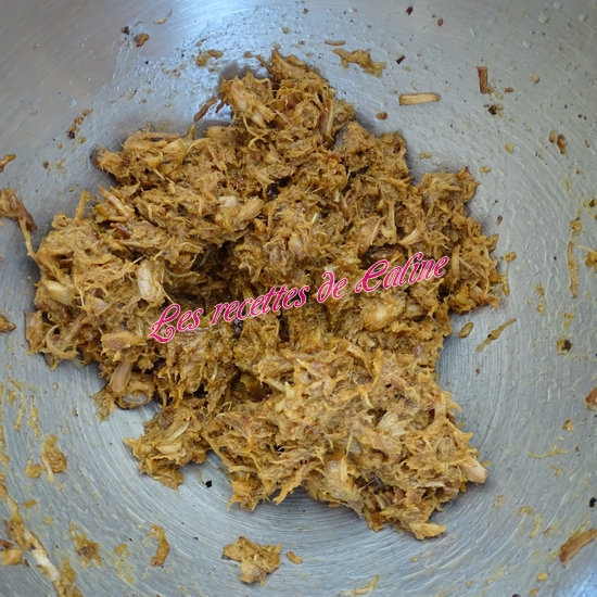 Au bout des 3 h pour voir si votre viande est cuite, placez un morceau dans l’écumoire et a l’aide de la fourchette écrasez-la, la viande va s’effiloché toute seule