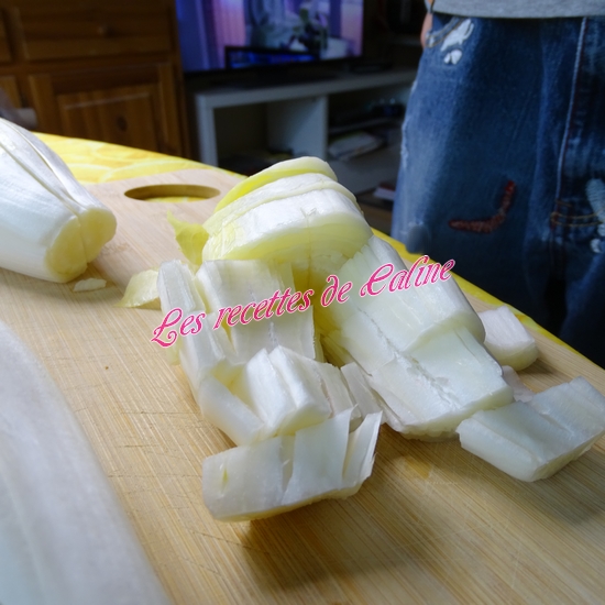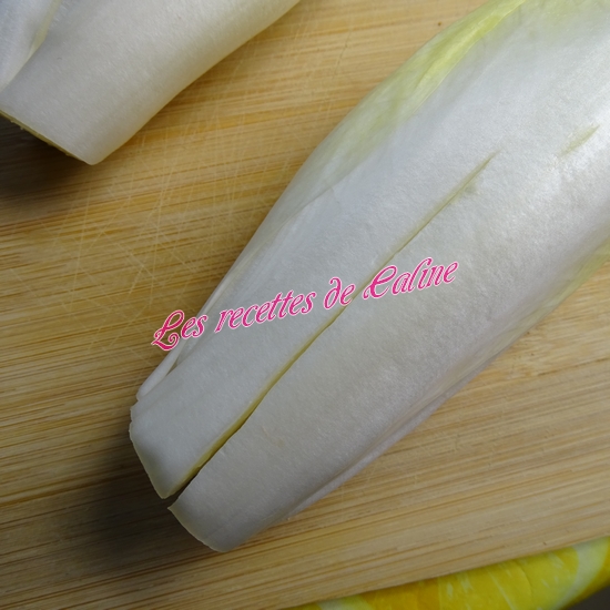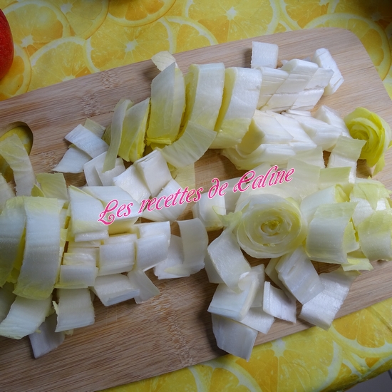 Coupez les endives en fines lamelles après en en avoir éliminé l’extrémité.
