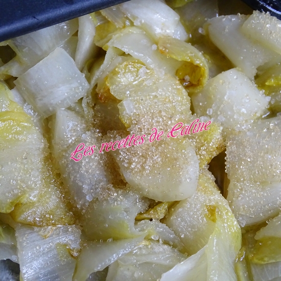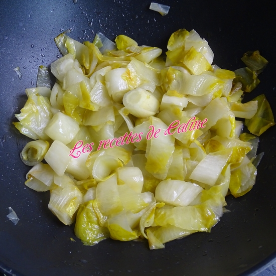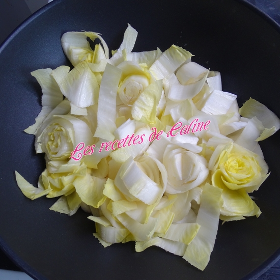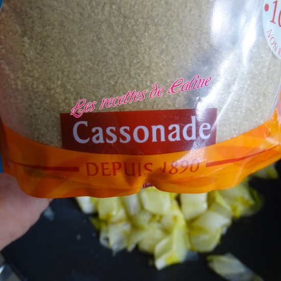 Dans une poêle, faire revenir les lamelles d’endives dans un peu de beurre, ajoutez-y 1 cuil à café de cassonade