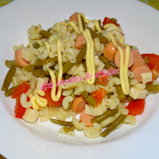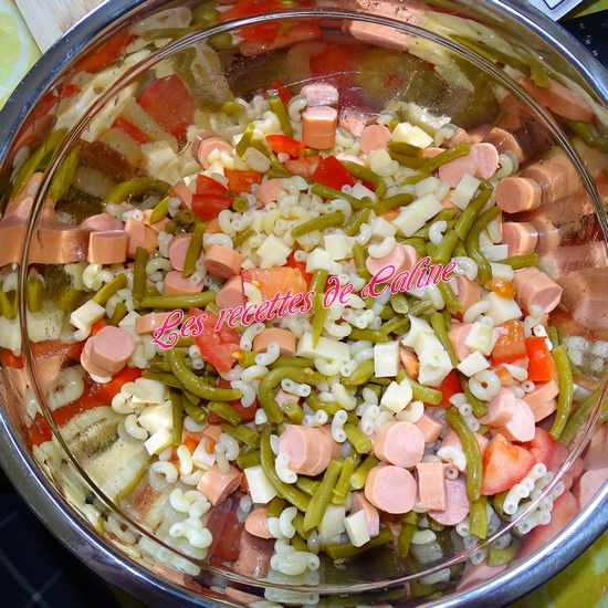 Placez les pâtes dans un grand saladier, ajoutez-y les haricots verts, les tomates, le gruyère, et les saucisses.