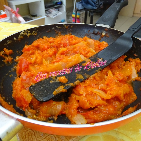 Ajoutez le verre d’eau et le concentré de tomate (j’ai ajouté 1 cuil à café de sucre en poudre car j’ai trouvé la préparation un peu amer).