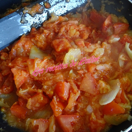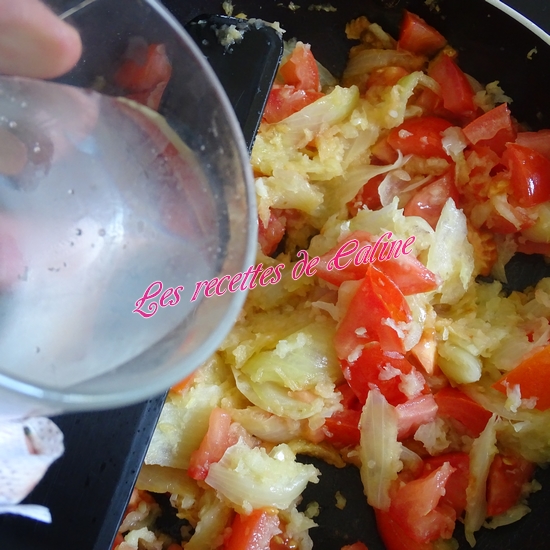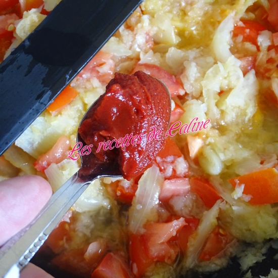 Ajoutez le verre d’eau et le concentré de tomate (j’ai ajouté 1 cuil à café de sucre en poudre car j’ai trouvé la préparation un peu amer).