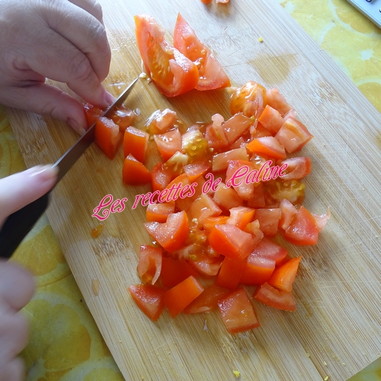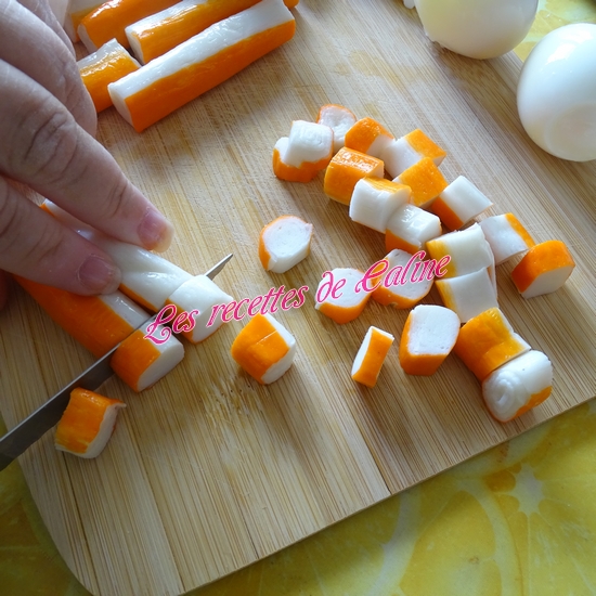Coupez les tomates en petits dés, les surimis en petits tronçons et les oeufs durs en rondelles.