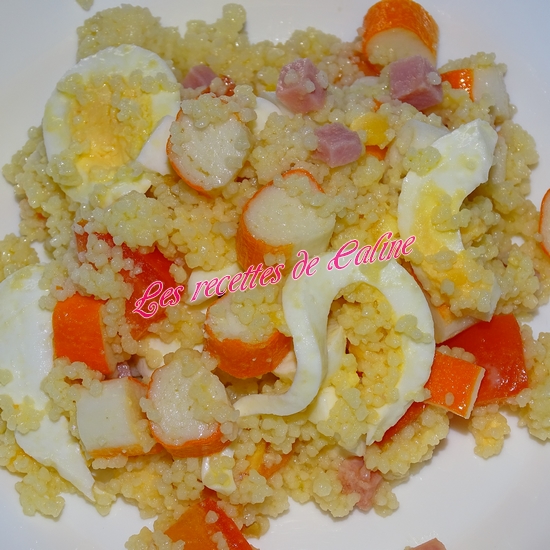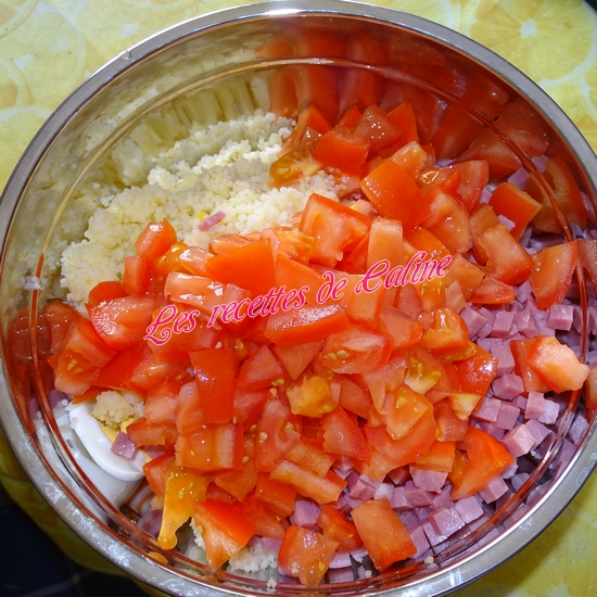 Versez les tomates, les surimis, les dés de jambon et les oeufs dans la semoule.