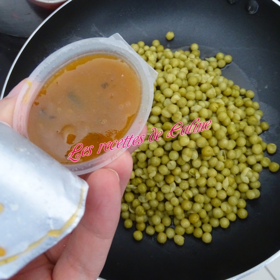 Dans une poêle, faites revenir les petits pois dans une noisette de beurre puis ajoutez la capsule de bouillon (je n’ai pas assaisonné car la capsule est déjà salé)
