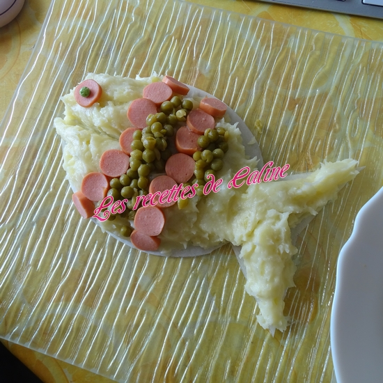 Pour les écailles, alternez des lignes de rondelles de knackis et des lignes de petits pois.