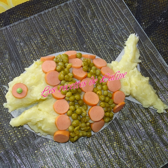 Sur 4 assiettes, dessinez un poisson en purée (pour faire mon poisson, j’ai pris un modèle sur google que j’ai reproduit sur du papier cuisson et que j’ai placé sur mon assiette et ensuite j’ai déposé la purée sur le papier cuisson) .