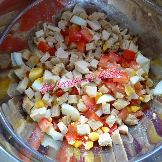 Dans un saladier mettre les oeufs, les dés de tomate, les dés de poulet, les lamelles de salade et la mayonnaise et