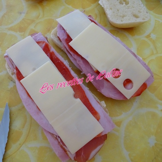 Placez 1 tranche d’emmental coupé en 2, puis 1/2 tranche de jambon blanc, puis 2 tranche de pays, remettre la seconde moitié de jambon blanc, étalez un peu de ketchup et finir avec 1 seconde tranche d’emmental.