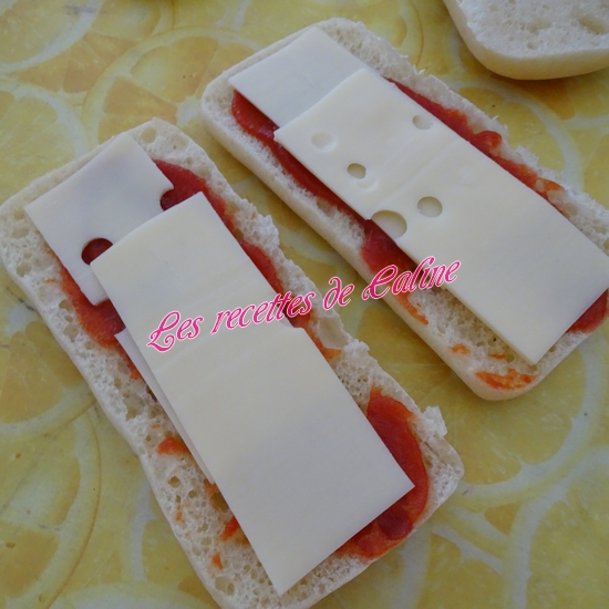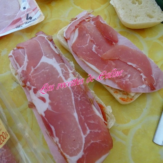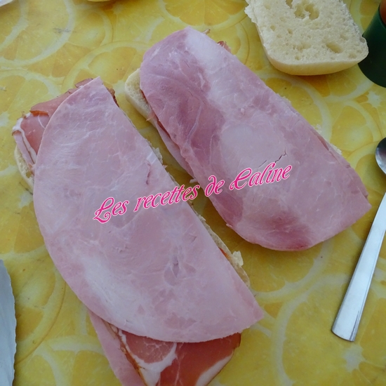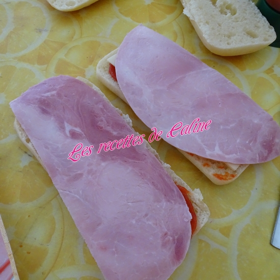 Placez 1 tranche d’emmental coupé en 2, puis 1/2 tranche de jambon blanc, puis 2 tranche de pays, remettre la seconde moitié de jambon blanc, étalez un peu de ketchup et finir avec 1 seconde tranche d’emmental.