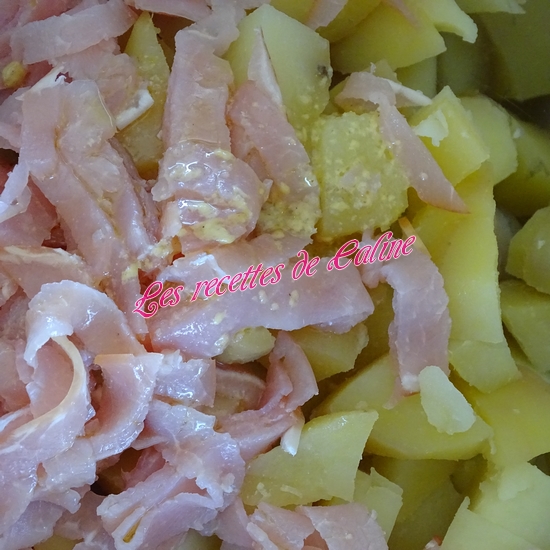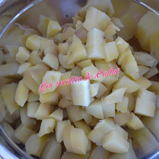 Une fois les pommes de terre cuites, épluchez-les (ATTENTION ! c’est chaud) et coupez-les en rondelles d’1 cm d’épaisseur (ou en cubes) et placez-les dans un saladier.
