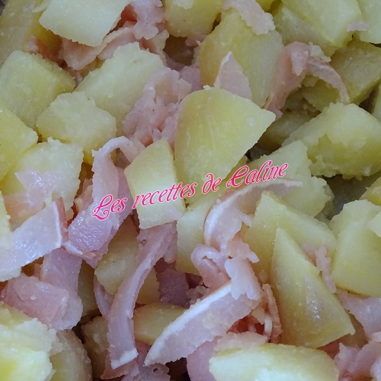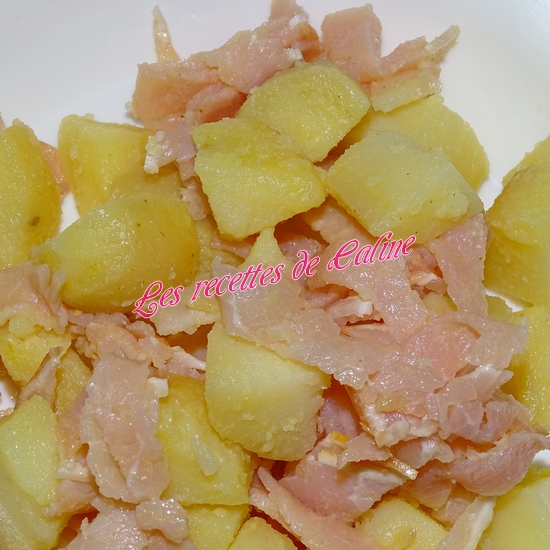 Coupez le bacon en fines lamelles et ajoutez-les au pommes de terre