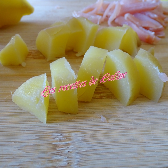 Une fois les pommes de terre cuites, épluchez-les (ATTENTION ! c’est chaud) et coupez-les en rondelles d’1 cm d’épaisseur (ou en cubes) et placez-les dans un saladier.
