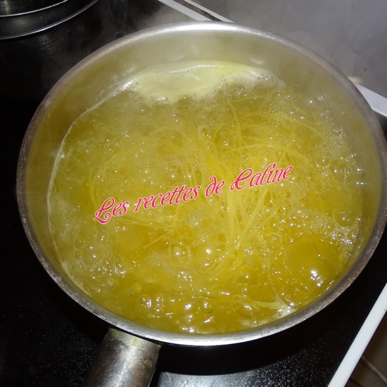 Faites cuire vos spaghettis 10 min dans une grande casserole d’eau avec le bouillon de volaille cube et un peu de sel. Une fois cuites, égouttez-les.