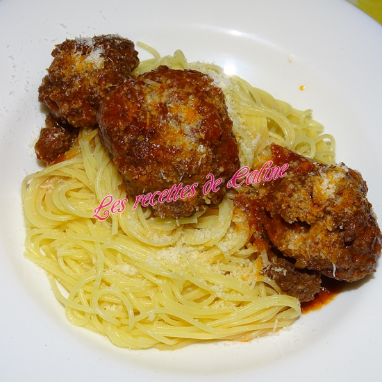 Servez vos spaghettis dans des assiettes creuses, ajoutez la sauce et les boulettes et nappez de parmesan.