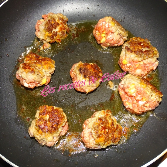 Dans un saladier, mélangez les 2 viandes, ajoutez la chapelure, l’oeuf et la seconde cuil à soupe d’oignon. Réalisez les boulettes de la taille d’une noix et les faites-les revenir dans une poêle bien chaude. Faites-les cuire 10 min.
