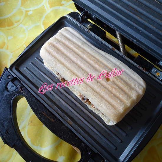 Pour avoir un peu plus de croustillant dans le pain, je les ai mis quelques minutes a chauffer à blanc dans l’appareil à panini, et je les ai laissé refroidir un peu avant de les garnir