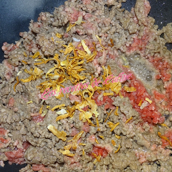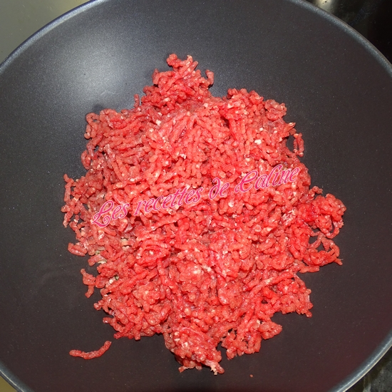 Dans une poêle, chauffer un peu d’huile d’olive à feu moyen, ajoutez-y le boeuf haché et le cuire 3 à 4 minutes en égrainant la viande à l’aide d’une cuillère en bois.
