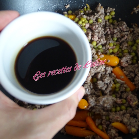 Ajoutez les légumes, la sauce Teriyaki ainsi que l’oignon.