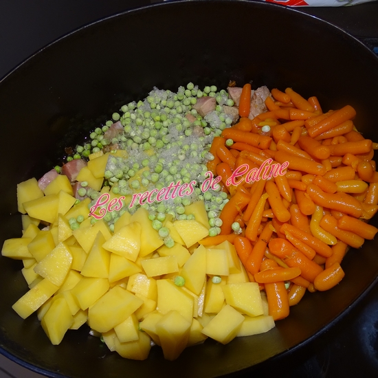 Ajoutez les légumes, les petits pois, 500 ml d’eau et le Bouillon de Bœuf.