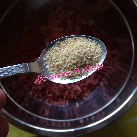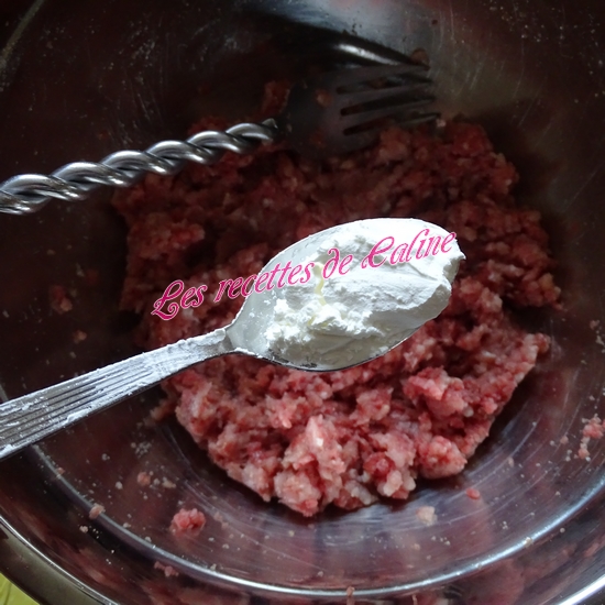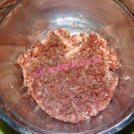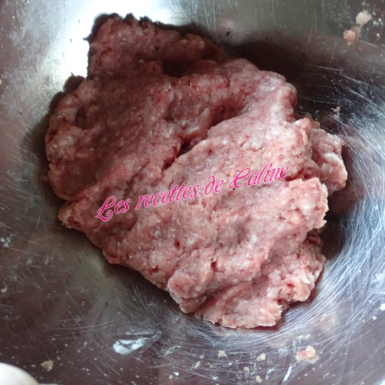 Mettre la viande hachée* dans un saladier (j’ai mis du porc et du boeuf, au moment de la photo ma viande de boeuf était encore congelé).