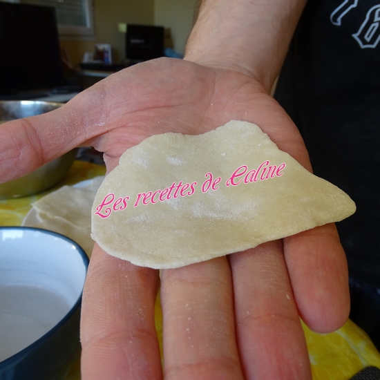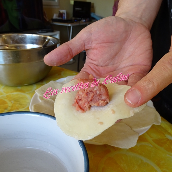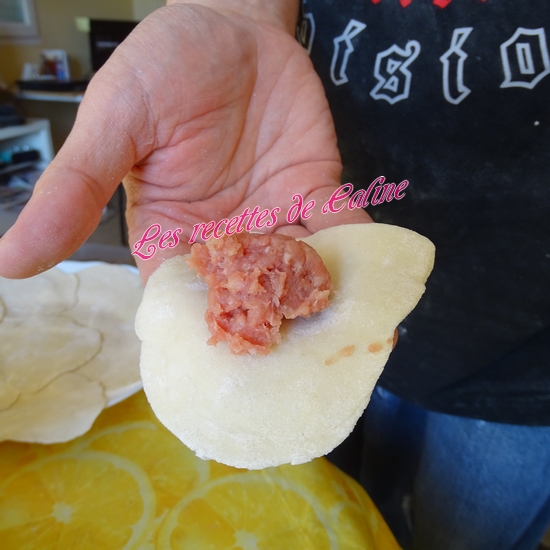 Prendre 1 cuil à café de farce et placez-la au centre d’un « disque » de pâte.