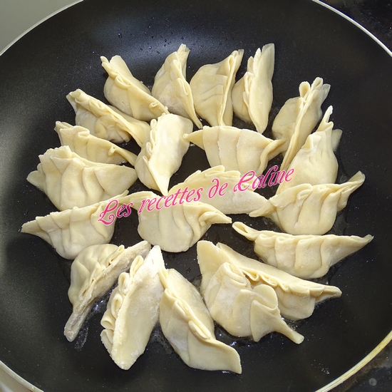 Mettre un peu d’eau sur la moitié des bords de la pâte et la refermer sur elle-même en y faisant 4 plis (Regardez la vidéo pour voir le pliage, simple a faire une fois qu’on a pris le coup de main). Faire la même chose avec le restant de farce et de pâte