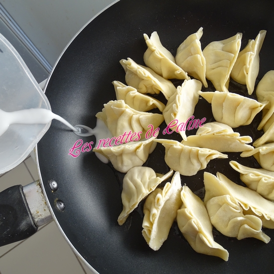 Mettre de l’huile dans une poêle, quand celle-ci est chaude, mettre les gyozas. Pour éviter que ça ne colle, rajouter un peu d’eau mélangée à 1 pointe de maïzena ou farine