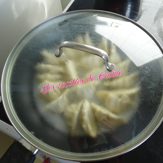 Mettre le couvercle, cuire sur feu moyen pendant 3 à 5 min (si vous avez une vieille gazinière, la cuisson peut être un poil plus long). Versez un peu d’huile de sésame sur les gyozas, remettre le couvercle quelques secondes.