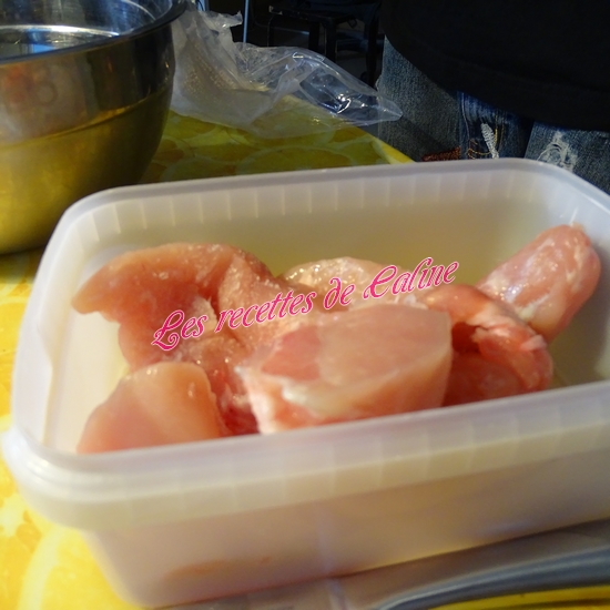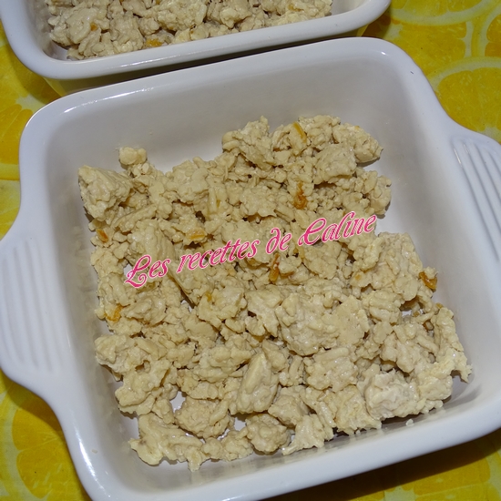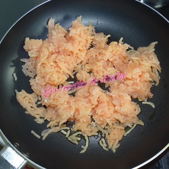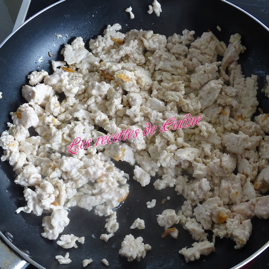 Dans une poêle, faites dorer les oignons hachés avec l’huile 5 min (je le mets avec le poulet vu que j’utilise de l’oignon séché). Ajoutez le poulet et poursuivez la cuisson 2 min.