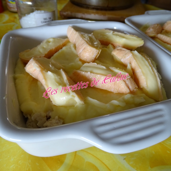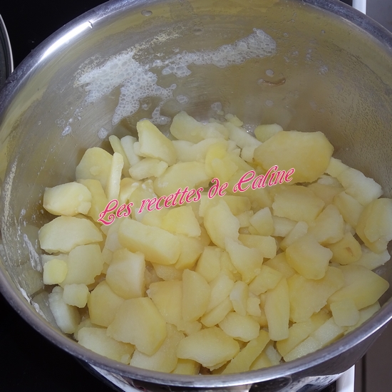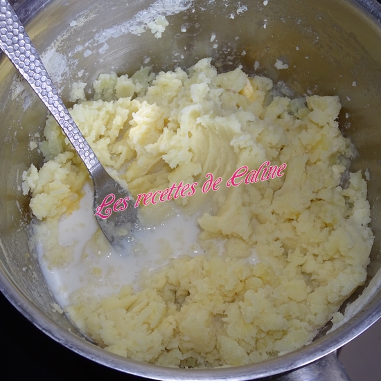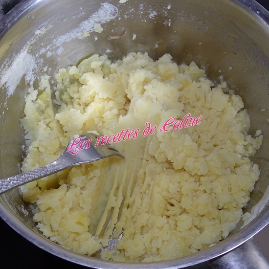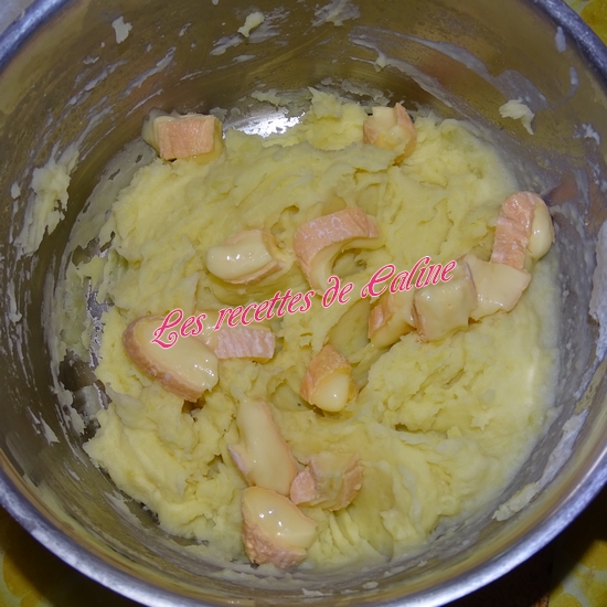 Préparez la purée instantanée selon le mode d’emploi (pour ma part, j’ai fait une vrai purée donc cuisson des pommes de terre, que j’ai écrasé après cuisson, un peu de beurre et du lait). Ajoutez quelques morceaux de fromage dans votre purée et bien mélanger.