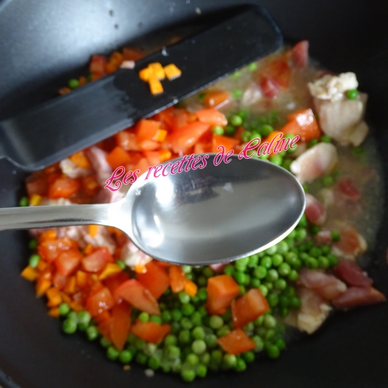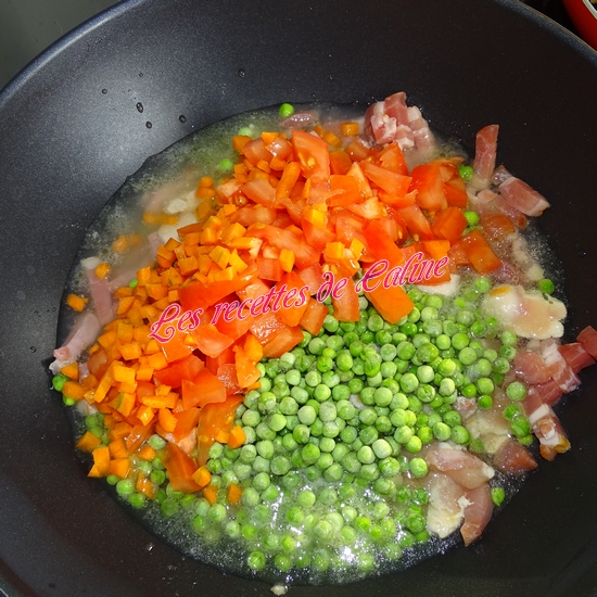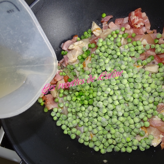 Ajoutez les petits pois, le vin blanc, la carotte, la tomate, le thym, le laurier et 4 cuil à soupe d’eau. Cuire le tout 20 min à feu doux et couverts en remuant de temps en temps.