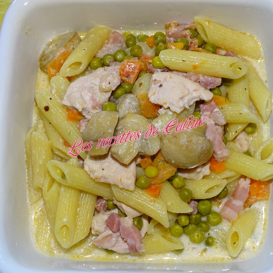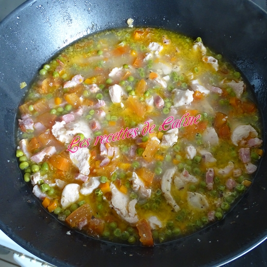 Faites revenir le poulet, les lardons et l’oignon dans une sauteuse avec
