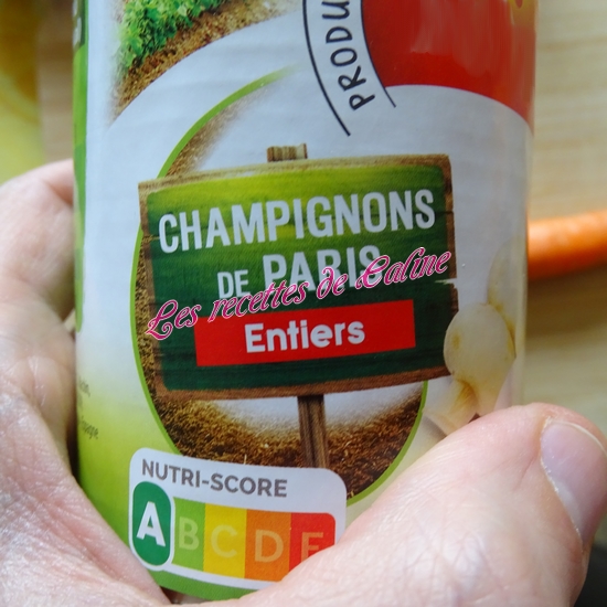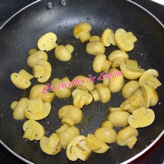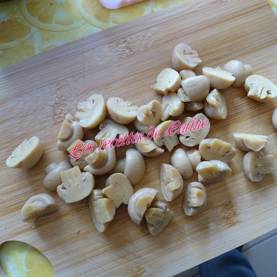 Lavez les champignons, épluchez-les et coupez-les également en fines lamelles (n’en ayant pas trouvé des frais, j’ai pris une boîte et j’ai coupé les champignons en 2).