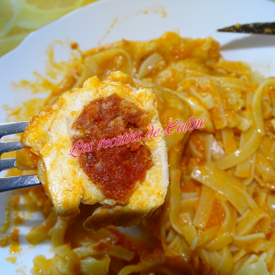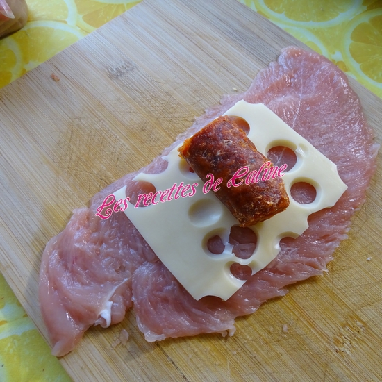Sur chaque escalope déposez 1 tranche d’emmental puis 1 morceau de chorizo de 6 cm.