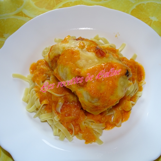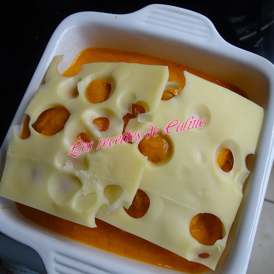 Versez la sauce dans le plat avec les roulés et déposez par dessus 2 tranches d’emmental, enfournez pour 15 à 20 min
