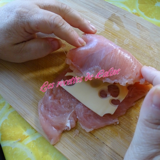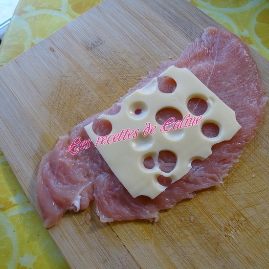 Sur chaque escalope déposez 1 tranche d’emmental puis 1 morceau de chorizo de 6 cm.