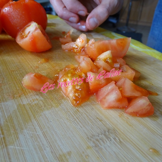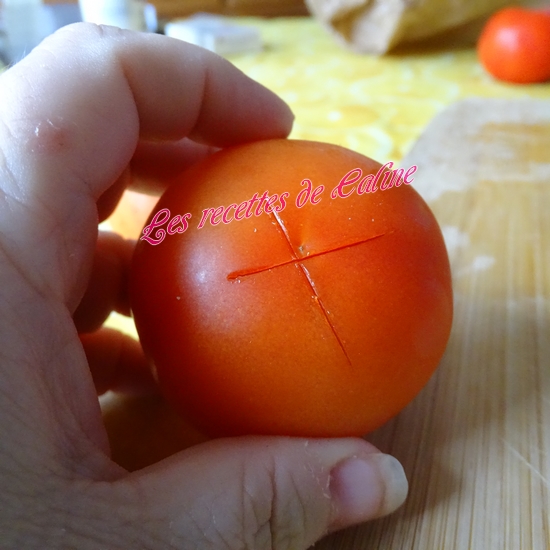 Plongez les tomates dans une eau bouillante pendant 30 secondes. Plongez-les en suite dans l’eau glacé et épluchez-les et coupez-les en petits dés.