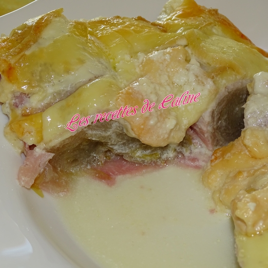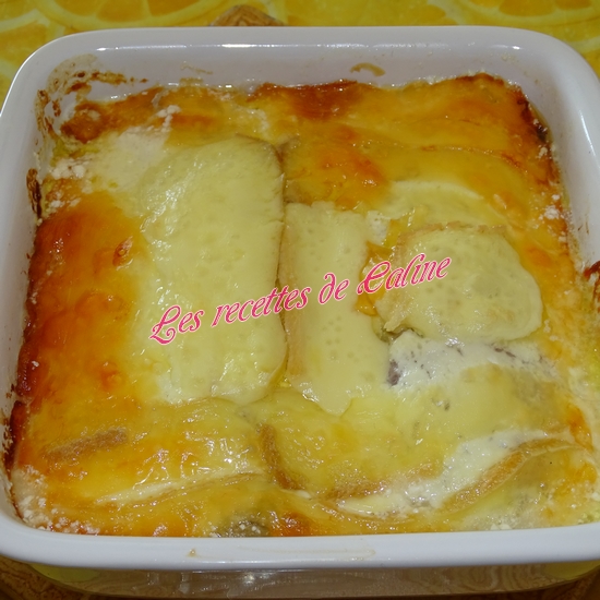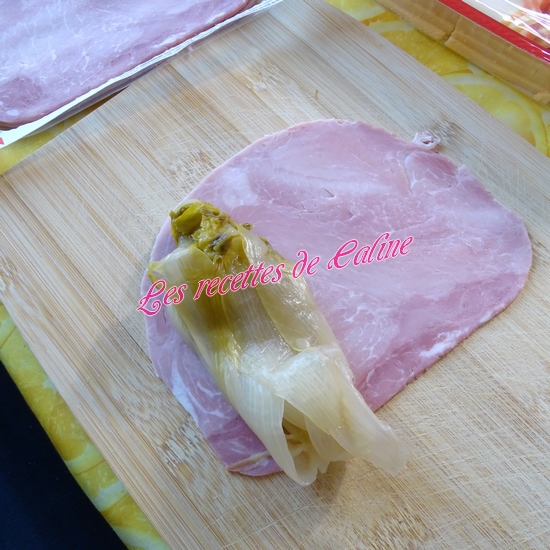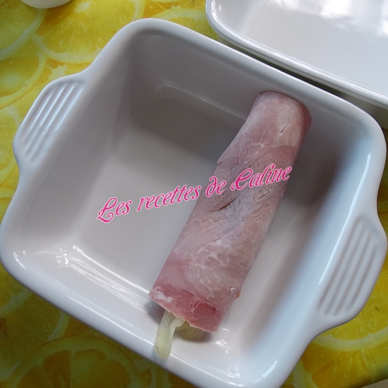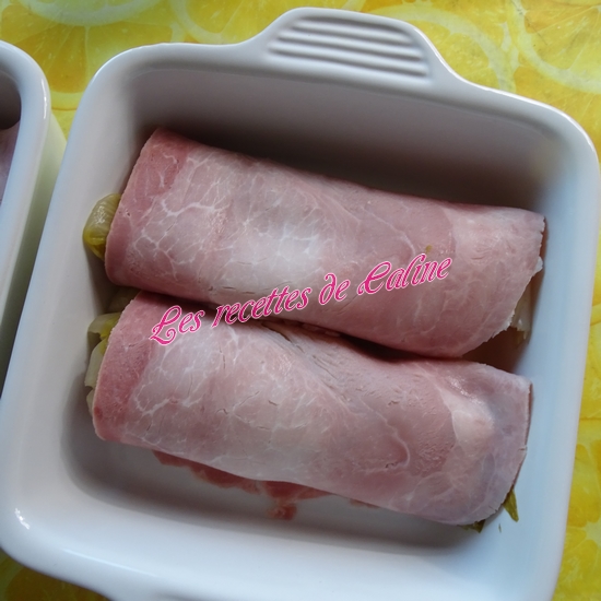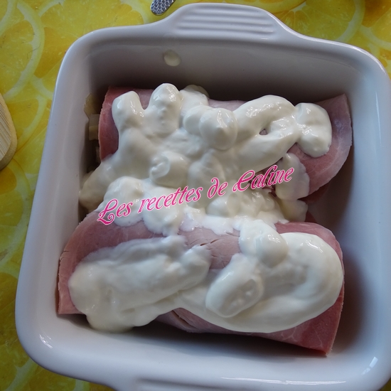 Dans un plat à gratin mettez la crème fraîche, puis déposez les endives cuites enroulées dans une tranche de jambon.