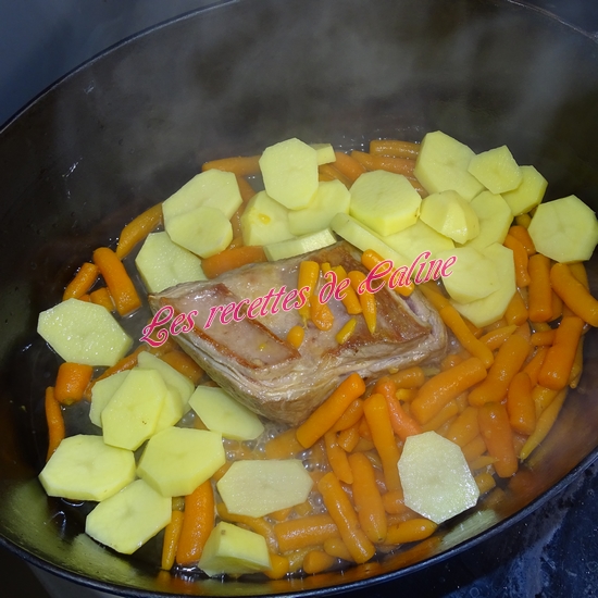Ajoutez l’oignon que vous aurez épluchées et coupées en 4, l’ail épluchées et entières , les carottes pelées , lavées et coupées en tronçons et enfin les pommes de terre pelées lavées et coupées en 4, mélangez bien le tout.