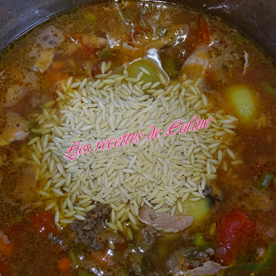 Incorporez les tomates (sans le jus), le risetti ** (orzo) et le bouillon.