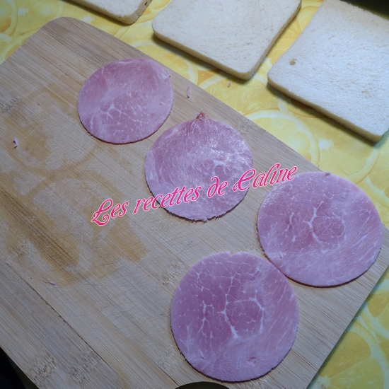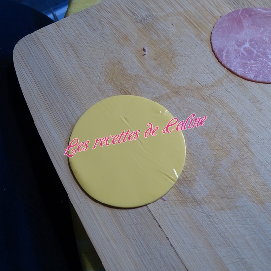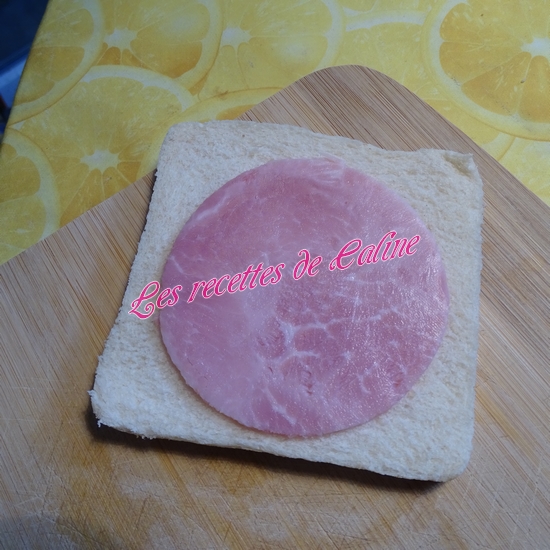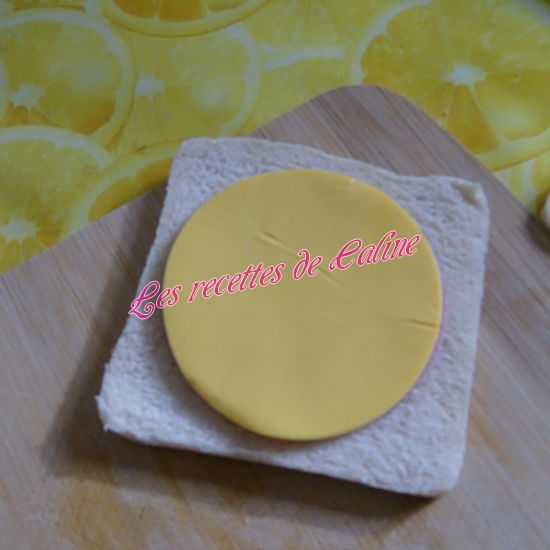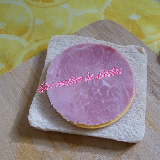 Découpez à l’aide d’un emporte pièce (légèrement plus petit que le pain de mie, afin de pouvoir souder les tranches de pain entre elles. ), les tranches de fromage et le jambon.