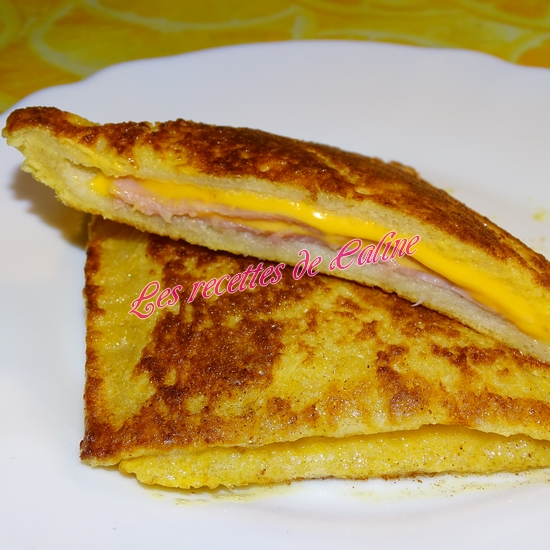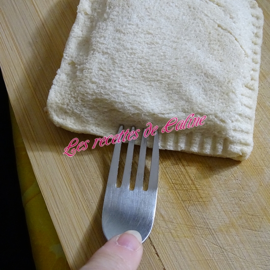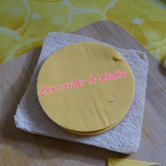 Déposez une tranche de chaque ingrédient sur une tranche de pain et couvrir d’une autre tranche de pain puis à l’aide d’une fourchette soudez les bords.