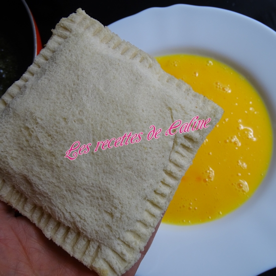 Trempez la première face du sandwich dans les oeufs battues. Retournez et faire de même.