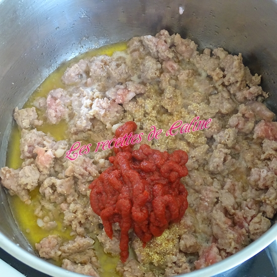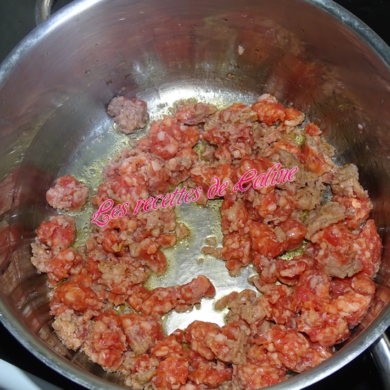 Faire revenir la chair dans l’huile d’olive, assaisonner à votre goût, attention que votre chair ne soit pas trop salé ( sinon ne salez pas)