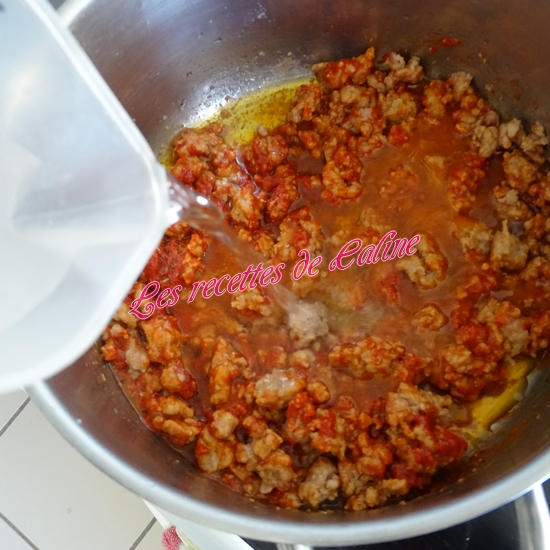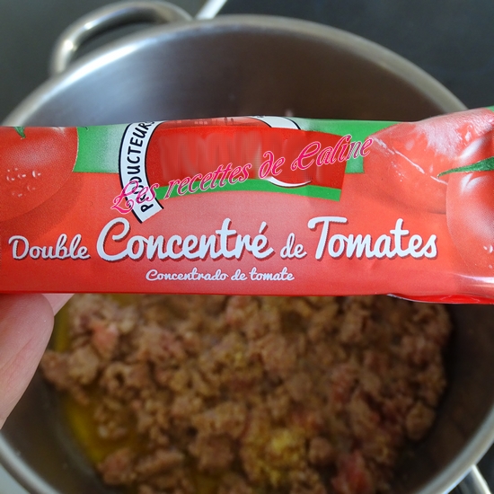 Quand la chair est bien revenue, ajoutez le concentré de tomate, l’eau, le thym et l’ail, bien mélanger.