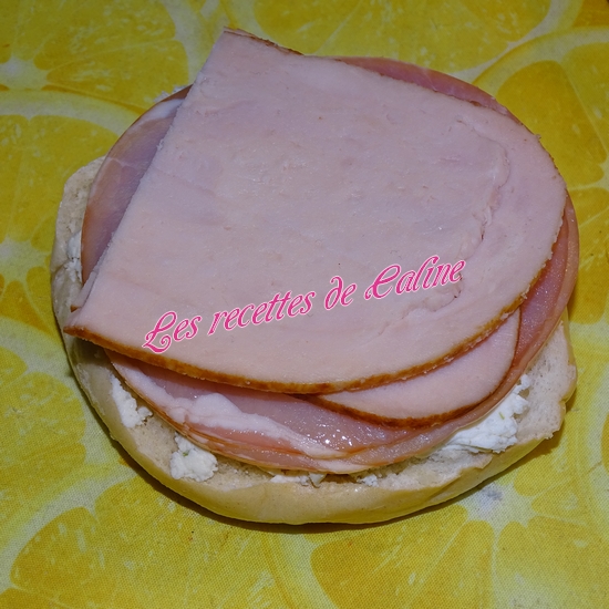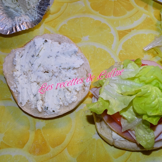Coupez les bagels en 2 dans le sens de la longueur et réchauffez-les légèrement à la poêle sans matière grasse.(Vu que j’utilise des pains à bagel surgelés, je les passe au four, directement)