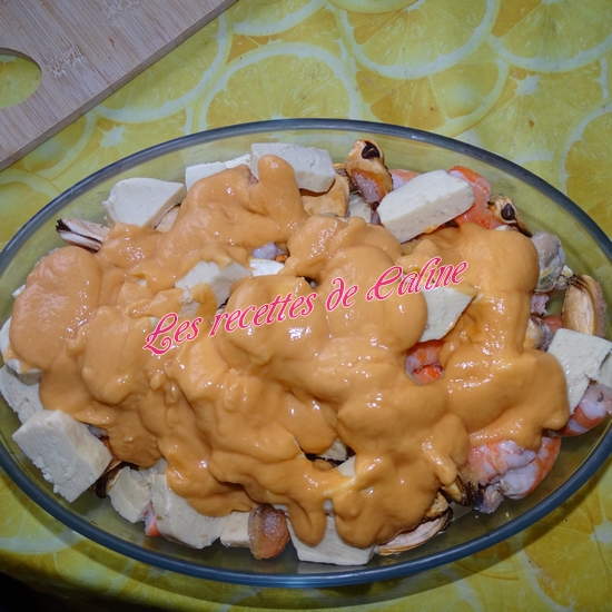 Versez la sauce Nantua dans le plat.(Pour ne rien perdre de la sauce, j’ai versez un peu de crème liquide dans le pot, bien remuer et versez dans le plat)