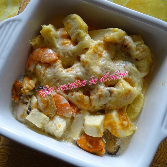 Placez les moules, crevettes et quenelles dans un plat allant au four, mélangez délicatement.