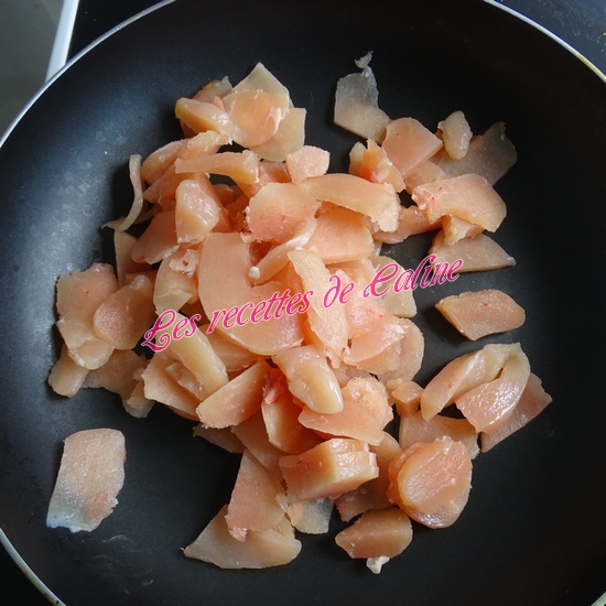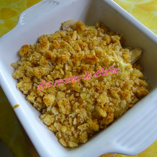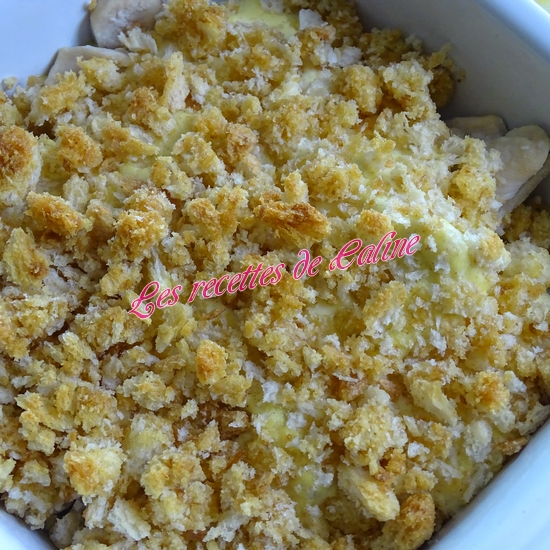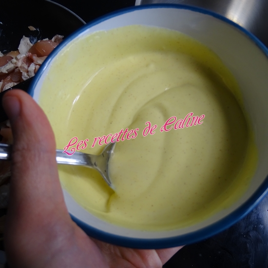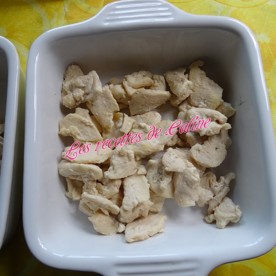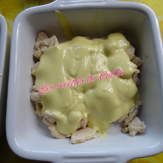 Dans un plat creux allant au four, mettre les lamelles de poulet puis versez la sauce crème-moutarde.